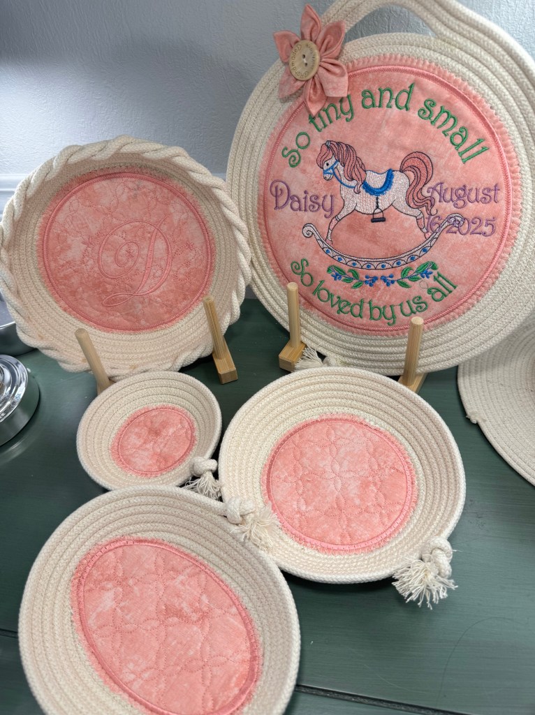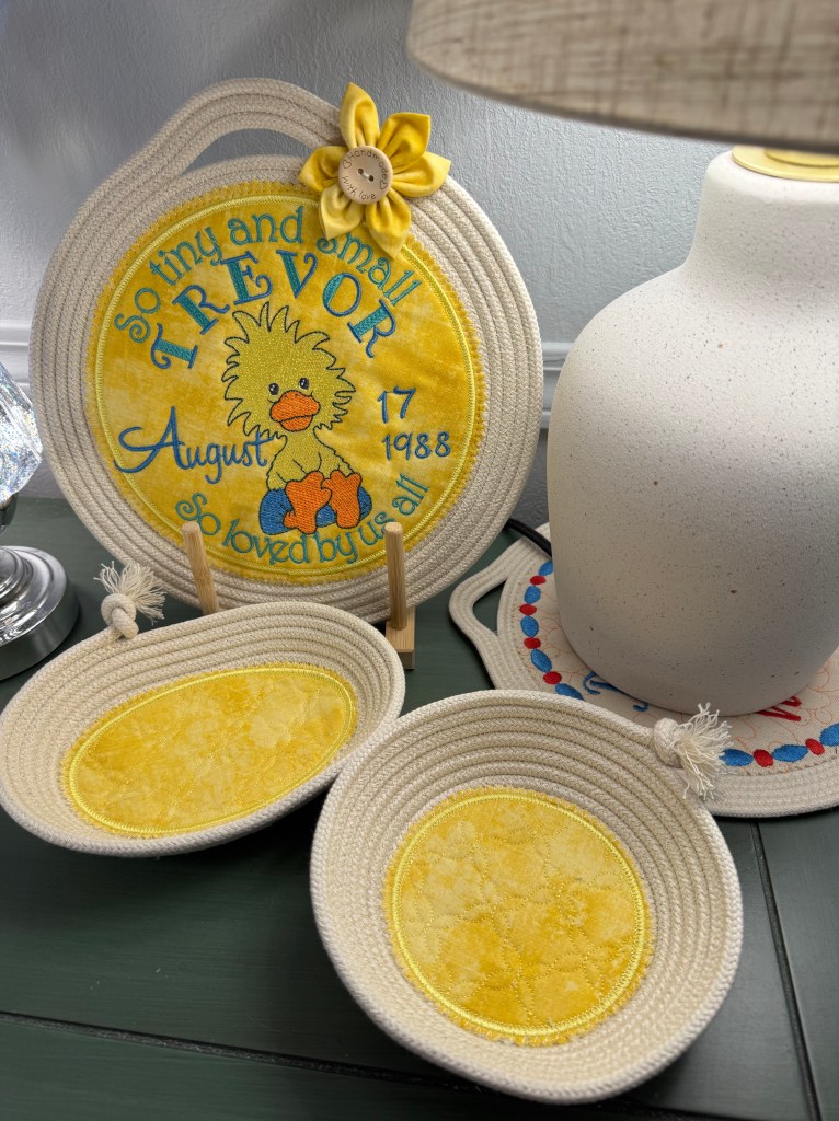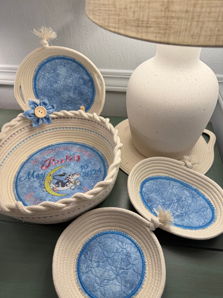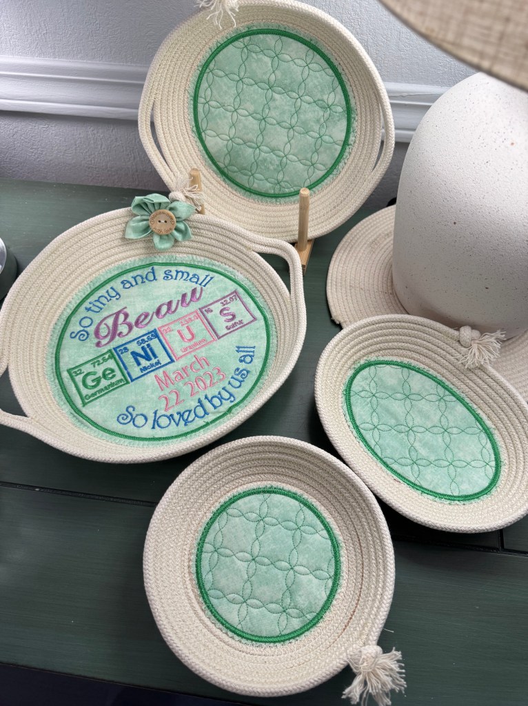 So excited to introduce my new personalized baby baskets and embroidered trivets 🤍